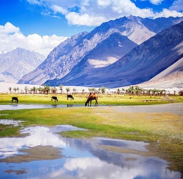 Begin your journey to Nubra Valley, traversing the awe-inspiring Khardung La Pass, renowned as one of the world's highest motorable roads. Along the way, visit the tranquil Diskit Monastery, providing panoramic vistas of Nubra Valley. Afterward, explore Hunder Village, celebrated for its sand dunes and Bactrian camels. Today blends cultural immersion with the excitement of conquering rugged terrains, guiding you into the heart of Nubra's stunning landscapes.